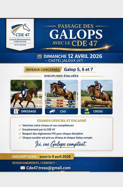 Bienvenue sur le formulaire d'inscription pour la session officielle de passage des Galops organisée par le Comité Départemental d'Équitation du Lot-et-Garonne (CDE 47).